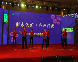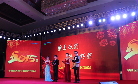 2015年2月8日,华威医药“因为你们?所以精彩”新春联欢晚会在南京金奥费尔蒙酒店隆重举行。下午16点整,南京市栖霞区委领导、江苏生命科技创新园管委会领导、江苏高科技投资集团领导、礼来亚洲基金领导及华威医药全体同仁共250余位嘉宾出席华威医药年度盛宴。在晚会主持人的新春祝福声中,与会嘉宾共同观看了“我们的2014”开场视频,共同分享和回顾了华威医药2014年度在各方面取得的优异成绩和精彩瞬间。