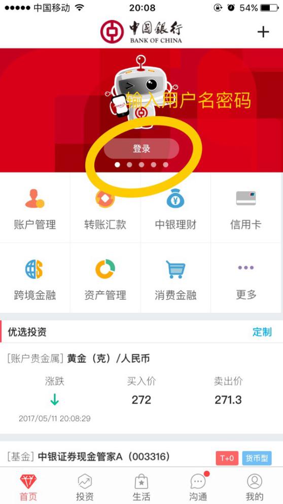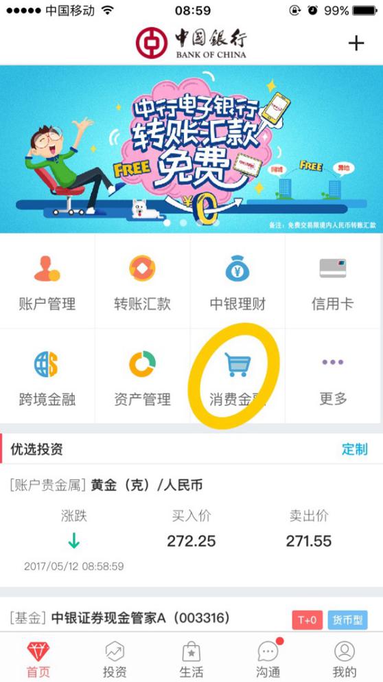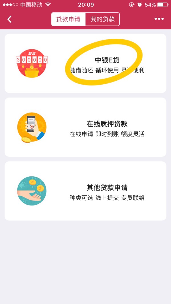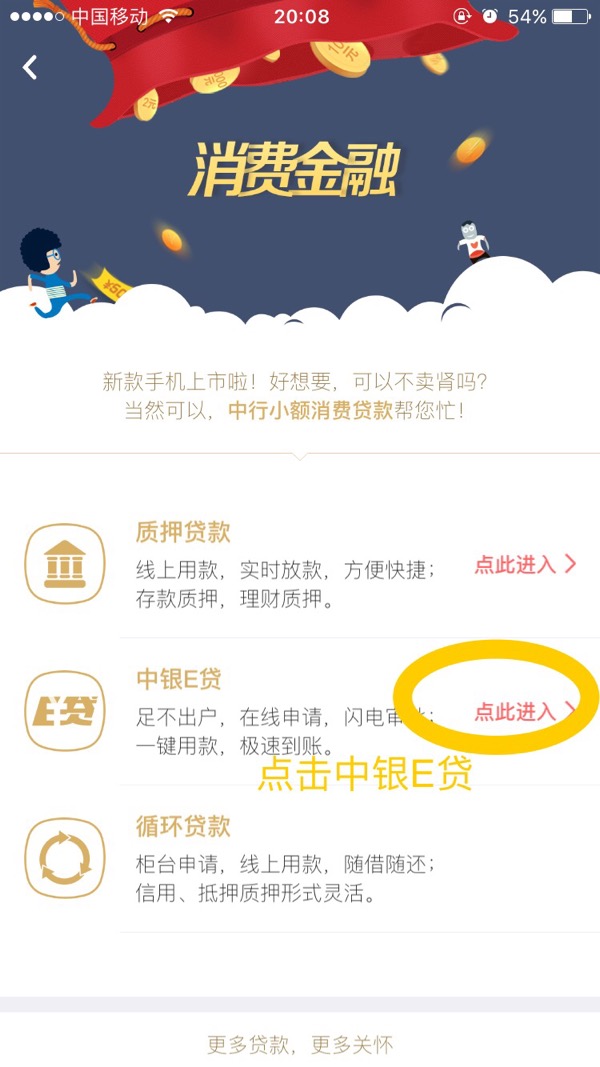 第二步:打开中国银行手机银行APP,点击“登陆”→“消费金融” →“中银E贷”