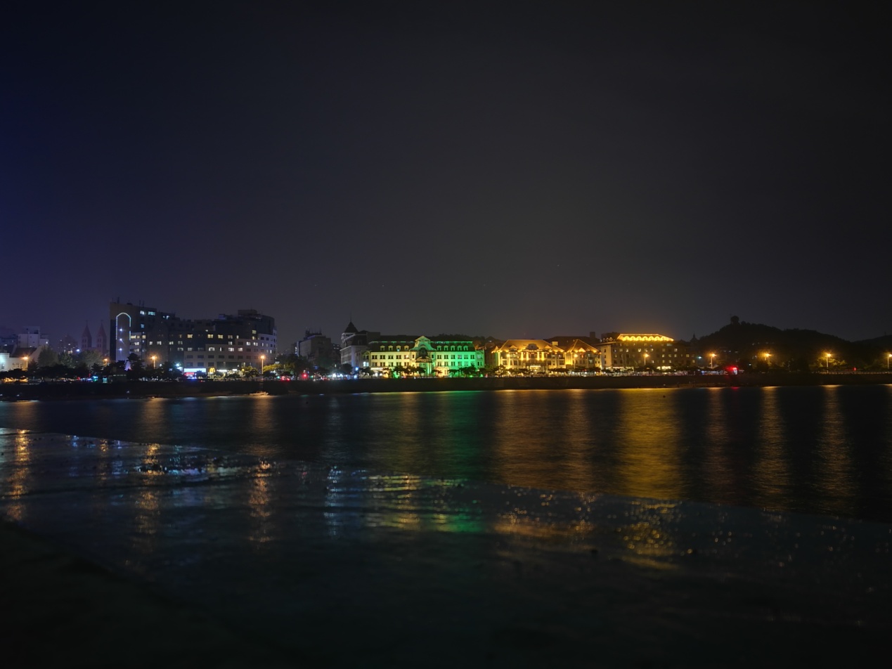 华灯初上,城市灯火辉煌,夜晚的栈桥穿上了华丽的礼服,和栈桥左面的中国功勋的中山舰艇遥相辉映,气势磅礴,比起上海的外滩来毫不逊色。