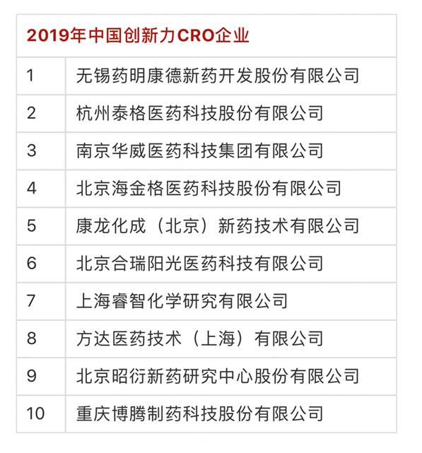 无锡药明康德新药开发股份有限公司、杭州泰格医药科技股份有限公司、南京华威医药科技集团有限公司等10家企业入榜“2019年中国创新力CRO企业”。