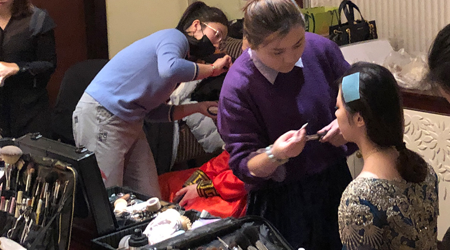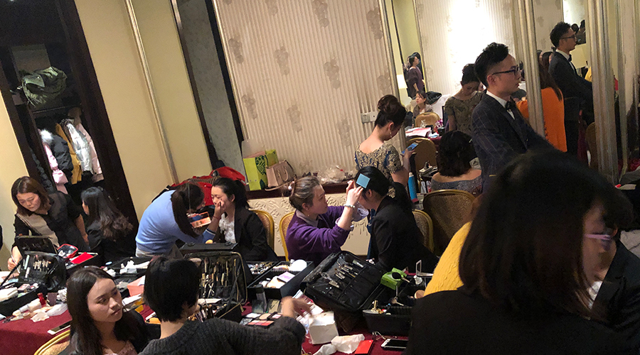 华威医药年会节目主持人全部到场,开始换服装、做造型、化妆。