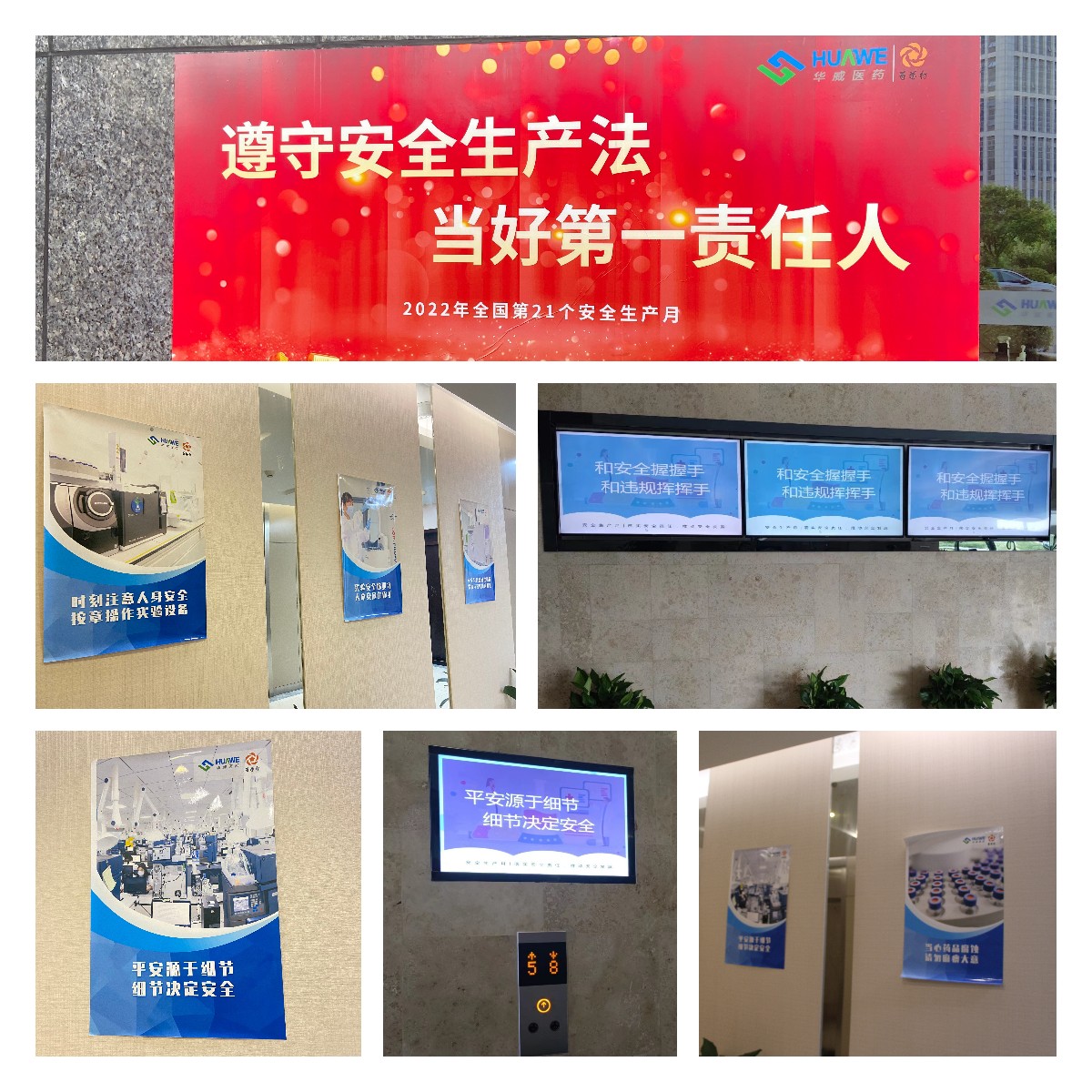 夯实安全生产责任,深化安全知识认知!华威医药安委会办公室提前筹备、细致部署,通过对公司C3以及F2栋大楼各楼层张贴警示海报;为实验室各类仪器设备、化学品仓库等添加标识标语;在公司各电子大屏进行安全生产月主题轮播等一系列安全文化宣贯,动员大家积极参与、深刻认识,为全公司营造出了浓厚的安全氛围。