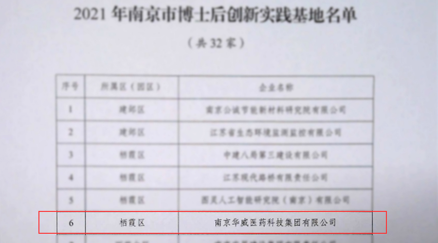近日,经南京市人力资源和社会保障局批准(宁人社[2021]123号),确定南京华威医药科技集团有限公司在内的32家单位获准设立南京市博士后创新实践基地。