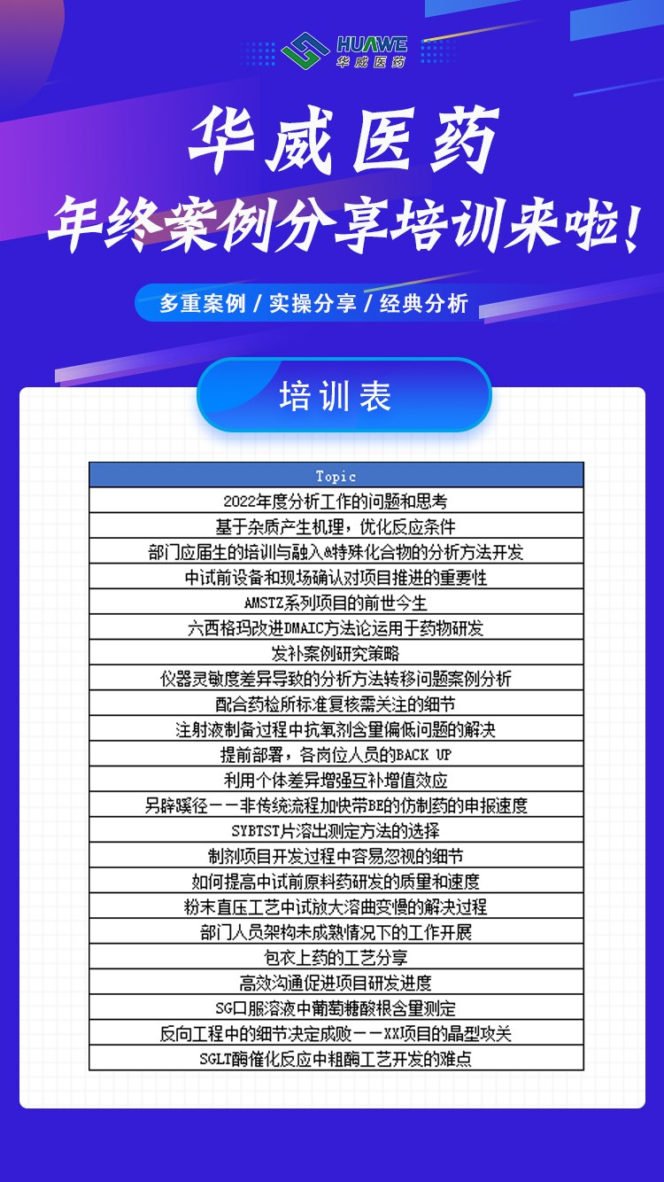 “基于杂质产生机理,优化反应条件”、“反向工程中的细节决定成败——XX项目的晶型攻关”、“仪器灵敏度差异导致的分析方法转移问题案例分析”、“发补案例研究策略”、“包衣上药的含量及均匀度控制技巧”、“高效沟通促进项目研发进度”、“部门应届生的培训与融入”...为期两天的培训里,华威医药研发体系各部门经理从专业技术角度、管理角度出发,结合实际案例,与大家共同总结分享。诚意满满的年度盘点、高强度的案例“充电”,让人直呼华威医药最卷“敬业福”上线!