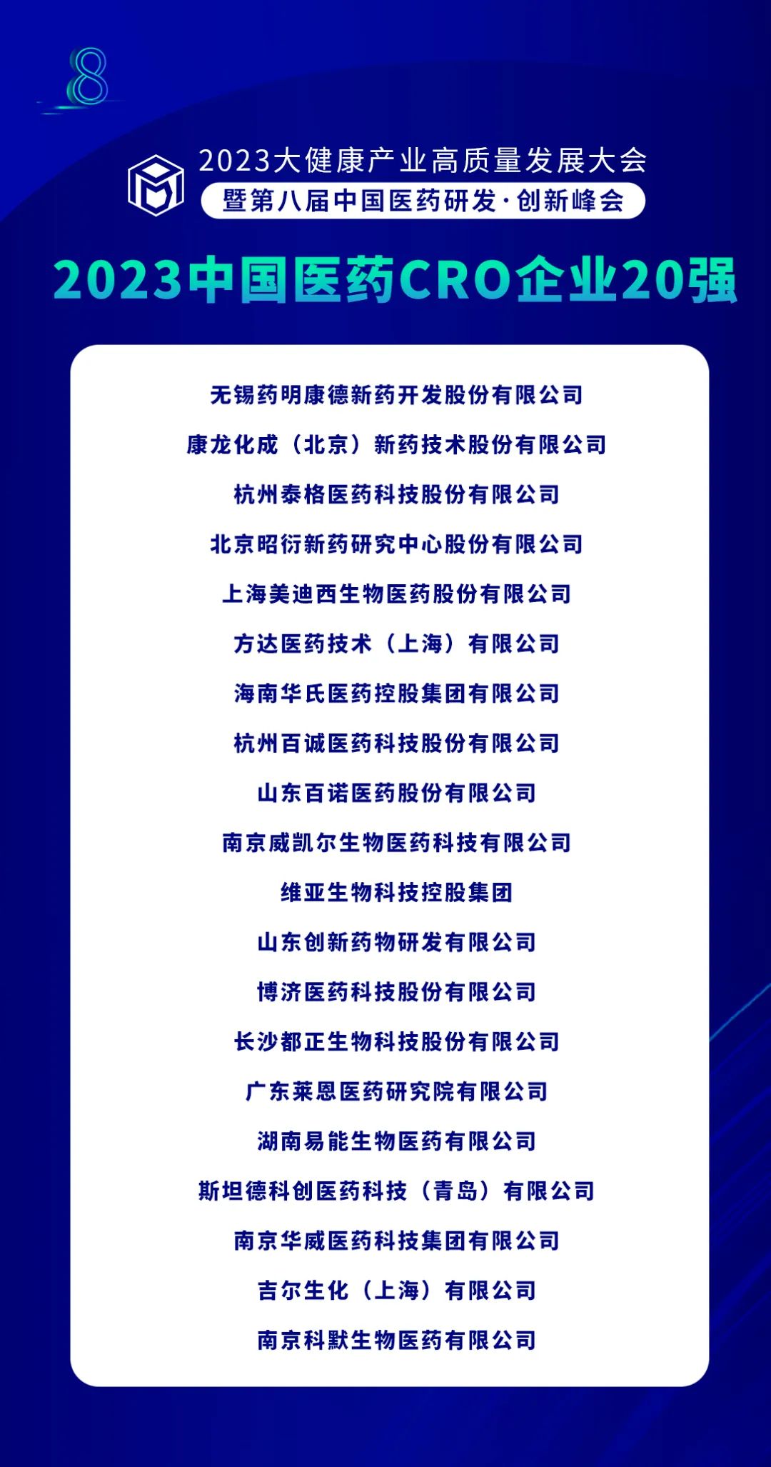 近日,2023年度中国医药CRO企业20强新鲜出炉