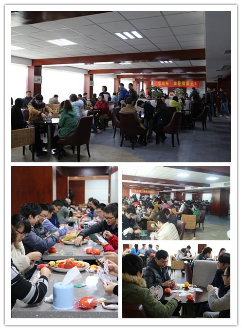 为迎接2016年新春,丰富员工业余文化生活,提高职工团队协作意识,促进职工之间的相互交流,公司特举办“华威杯”迎新年掼蛋大赛。比赛由员工自由组合和配对,共48对选手参与了比赛。本着友谊第一,比赛第二的精神,比赛现场既有紧张的比赛氛围,也充满了欢声笑语。经过40余场的激烈角逐,来自合成三部的贾凯、宁朋获得了第一名,来自合成六部的沈东、于智宇获得了第二名,来自合成三部的赵冬冬、程奇获得第三名。
