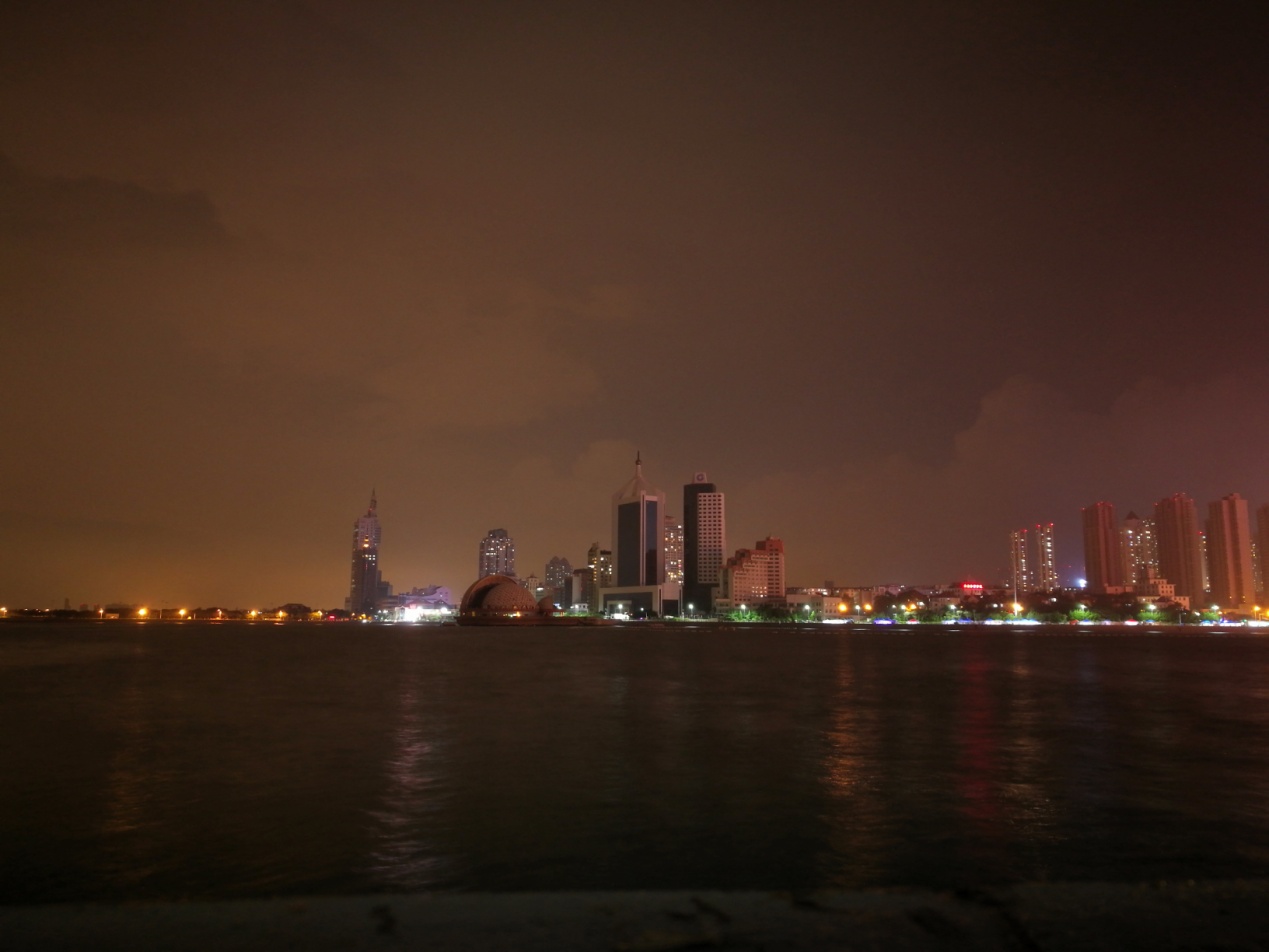 华灯初上,城市灯火辉煌,夜晚的栈桥穿上了华丽的礼服,和栈桥左面的中国功勋的中山舰艇遥相辉映,气势磅礴,比起上海的外滩来毫不逊色。