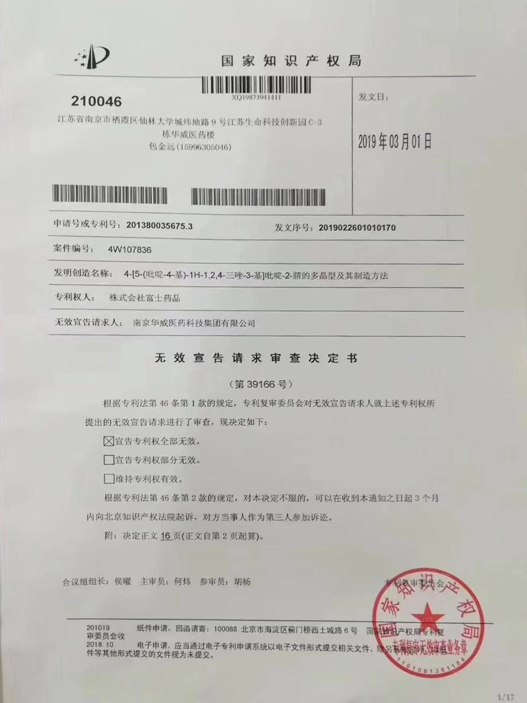 2019年3月1日,接国家知识产权局专利复审委员会无效宣告请求审查决定书,华威医药集团成功无效日本富士药品“托吡司特晶型专利”,宣告其发明专利CN104411700B(专利申请号为201380035675.3,专利权届满日2033年)的专利权全部无效。该项目的原研晶型专利技术在中国失去了专利权,加速了中国痛风类药品新时代的来临!